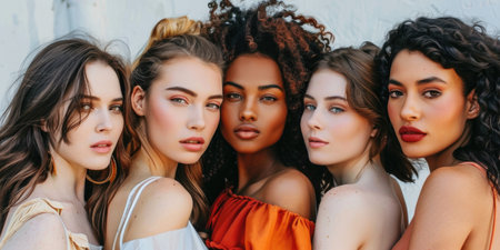 Diverse group of confident women standing side by side, showcasing different beauty and ethnic backgrounds. Unity and empowerment concept.