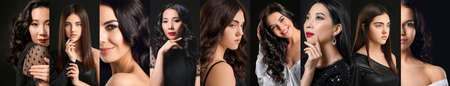 Elegant women of different ethnicities arranged in profile, wearing sophisticated colorful attire with perfect makeup and styling.