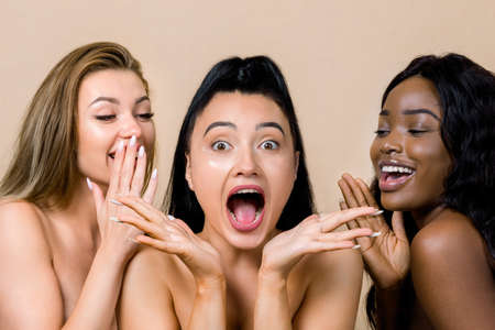 Emotional portrait of beautiful multiracial young women. Happy excited asian young woman in centre with african and caucasian girls, whispering something nice to her. Isolated on beige background.