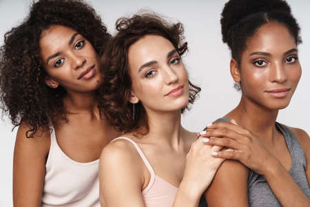 Portrait of three adorable multiethnic women hugging together isolated over white background