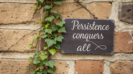 Vibrant green ivy climbs an old brick wall next to a weathered sign inscribed with 'Persistence conquers all', representing endurance and determination, perfect for motivational themes.