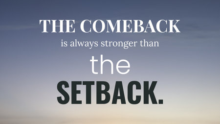 A motivational quote on a blurred blue sky background. The text reads, THE COMEBACK is always stronger than the SETBACK.