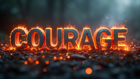 COURAGE in metallic 3D letters amidst digital fire in stormy setting