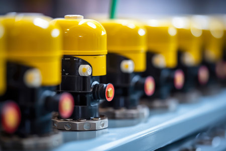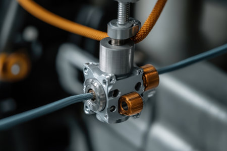 Close-up of factory robotic joint with sensors and hydraulic lines in sharp focus