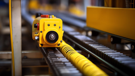 Generative AI Fragment inside a modern plant producing power electric cable and optical fiber. Interior of modern production line. Finished goods on container cable reels for transportation and sale of consumer