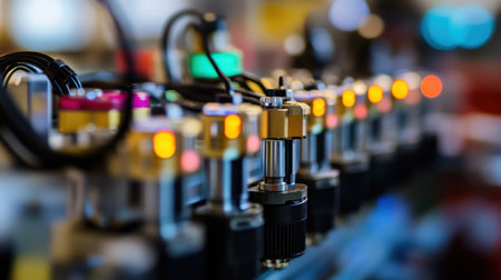 This vibrant close-up image captures metallic components with coils, illuminated by colorful lighting to create a dynamic and modern atmosphere.