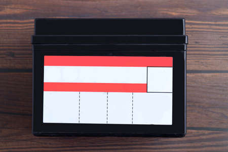 Battery anode terminal with red plastic cover is installed on a black battery in a electric system of car engine, Automotive electronics parts concept.