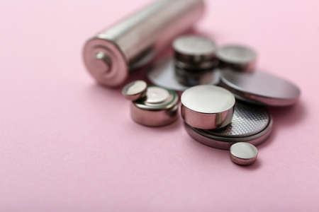 Energy, abstract colorful background. Top view of round, alkaline batteries. Several batteries are next to each other, standing on a colored background.