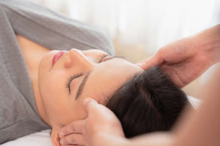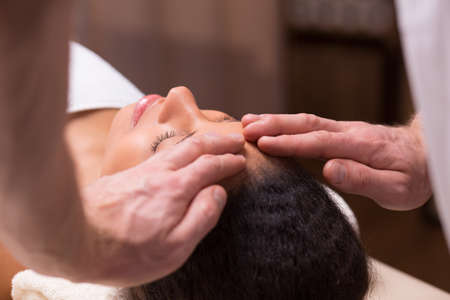 Craniosacral therapy massage. Therapist massaging woman’s forehead.