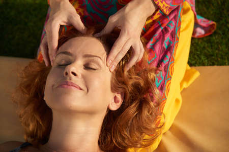 Thai yoga head massaging. Satisfied caucasian womans face.