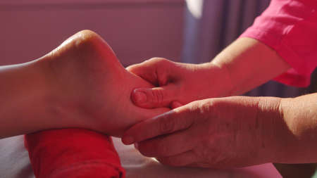 Acupressure therapy and reflexology specialist affecting special points and areas on young girls feet. Qualified therapist doing remedial therapeutic stress reducing foot massage to female patient