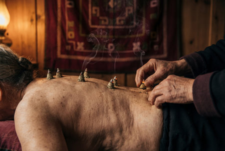 A practitioner places smoking moxa cones on the wrinkled back of an elderly woman during a traditional chinese medicine treatment session in a warm wooden room.