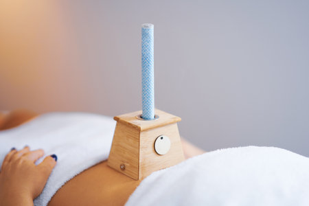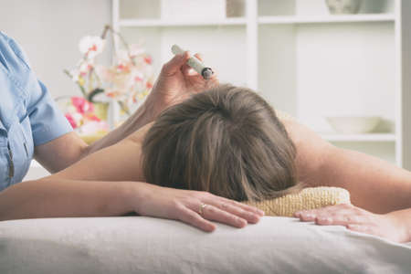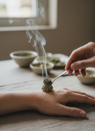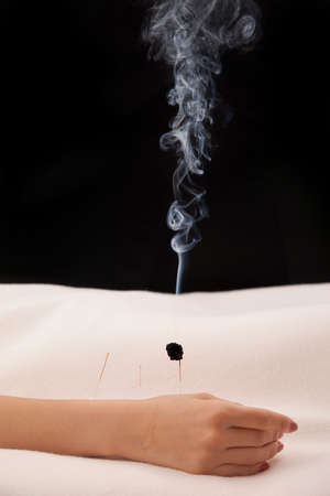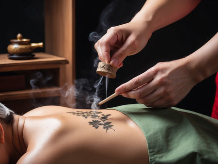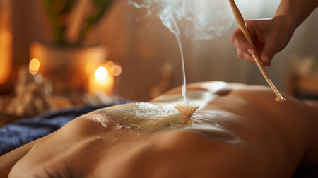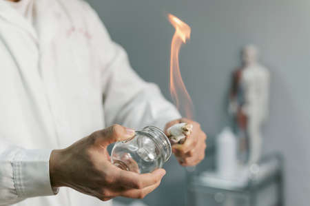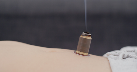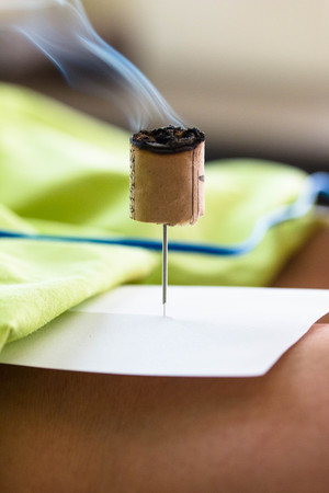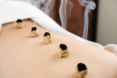 Detail of an acupuncture therapist using moxibustion on the back of a patient