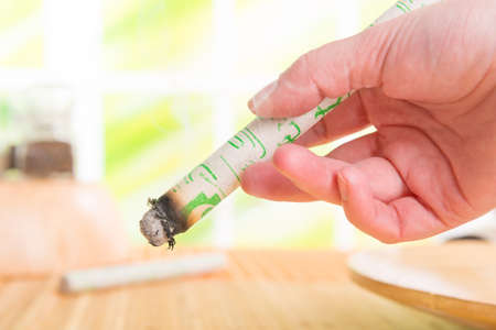 Smoke streams from the end of a burning joint in a woman's hand. Joint is covered in oil and kief or THC powder.