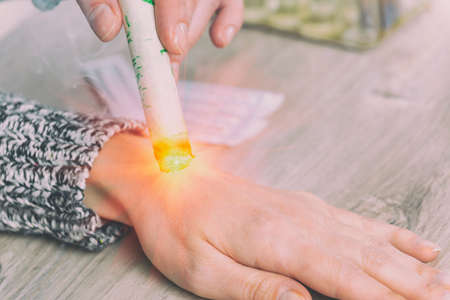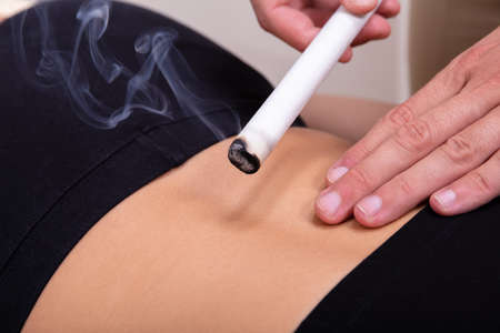 Moxibustion procedure at health centers. Alternative medicine therapist doing moxa treatment. TCM Traditional Chinese Medicine.