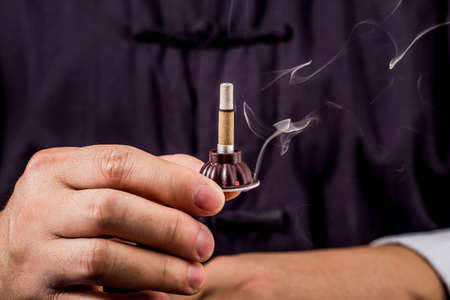 Senior man making incense in the temple, closeup of photo, Senior Chinese doctor giving moxibustion, AI Generated