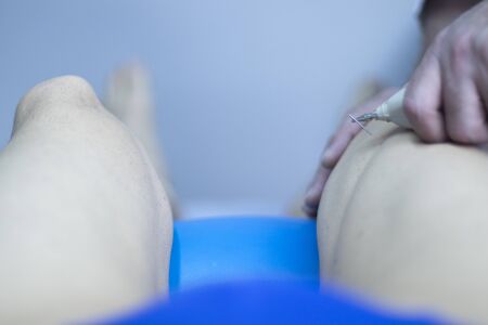 Macro detail of female hand using an insertion tube to insert a Goshin acupuncture needle in the back of a female patient.