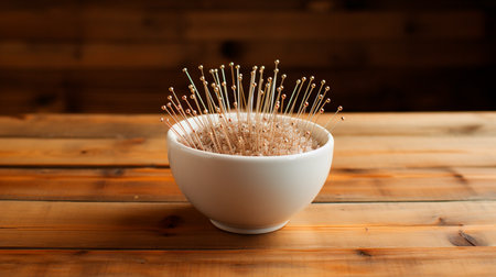 Vibrant pins arranged on skin in gentle sunlight, capturing the delicate art of traditional therapy with a peaceful, calming ambiance.