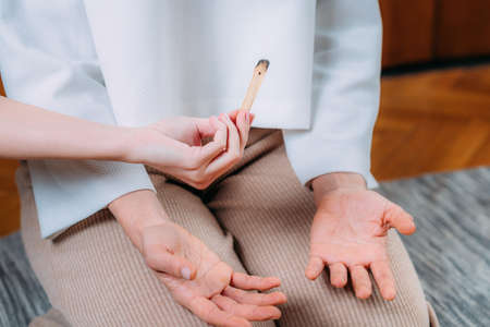 Peaceful Woman Sitting and Meditating, Spiritual Coach with Palo Santo Stick