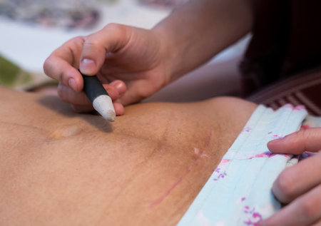 Close-up Of A Male Therapist Woman Undergoing Moxa Stick Treatment On Woman's Back