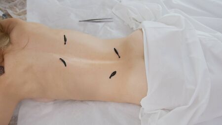 Needles and porridge stuck in a woman's back in a bright acupuncture clinic
