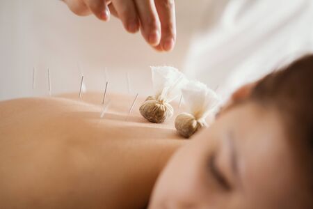 Close-up of senior female back with steel needles during procedure of the acupuncture therapy
