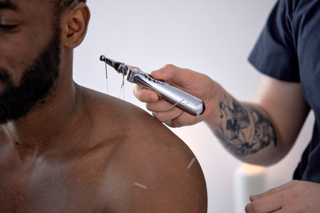 cropped doctor sticks needles into black male body on the acupuncture, using device. unrecognizable skilled professional doctor treating male client, needles on back spine shoulders.