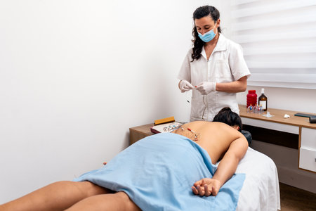 close up woman undergoing acupuncture treatment with electrical stimulator on back