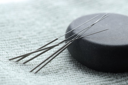 Acupuncture needles and pebble stone on towel, closeup