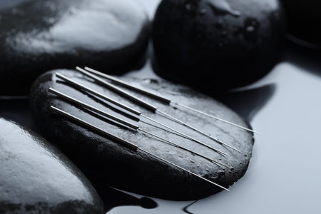 Acupuncture needles and wet spa stones on water surface, closeup