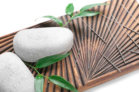 Board with acupuncture needles and spa stones on white background, closeup