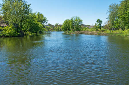A small picturesque creek in the European provincial town on a sunny spring day
