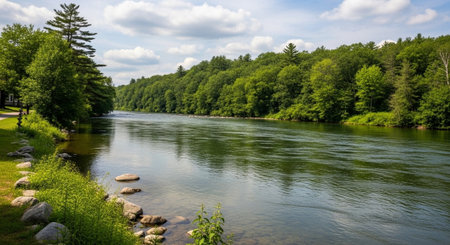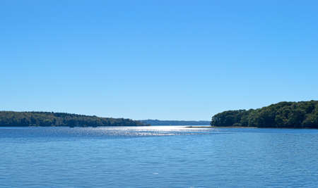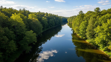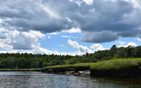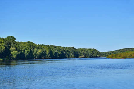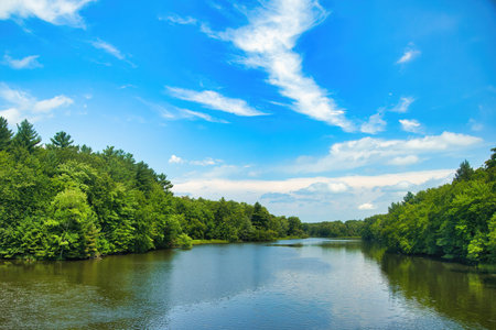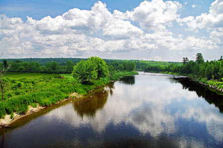 Beautiful summer landscape of Fisher River in Wisconsin and forest on blue sky background.