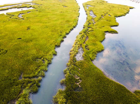 Scenic view of a marsh and a tidal river.