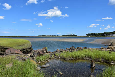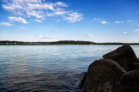 Blue skies with puffy clouds off the coast of Cape Cod in Massachusetts.