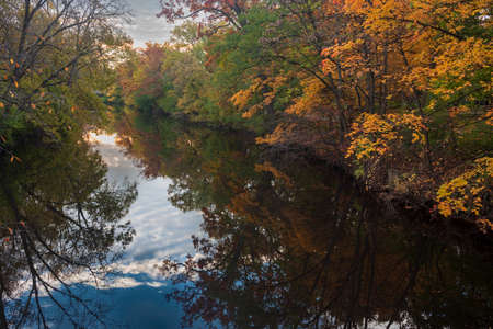 Autumn landscape with river and colorful trees reflected in the water.