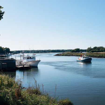 Two boats cruise along a serene river under a bright blue sky surrounded by green trees and calm waters during daytime.