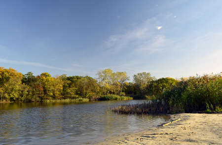 Landscape of the river in the autumn forest. View of the river and forest.