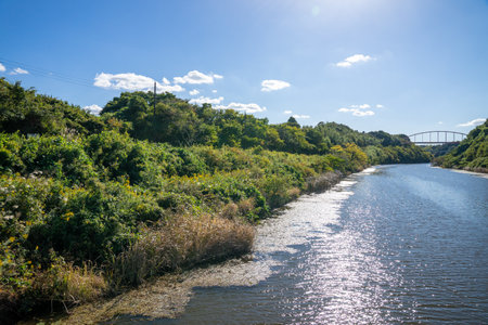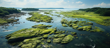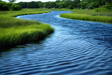 A tranquil river meandering through vibrant green marshlands, surrounded by dense vegetation under a clear sky. perfect for showcasing natural beauty, outdoor adventure, travel destinations, or tranquility themes. Generative AI
