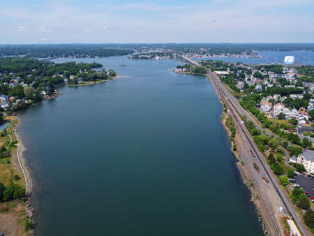 Aerial view of Essex Bridge across Danvers River mouth at Salem Harbor in city of Beverly, Massachusetts MA, USA.