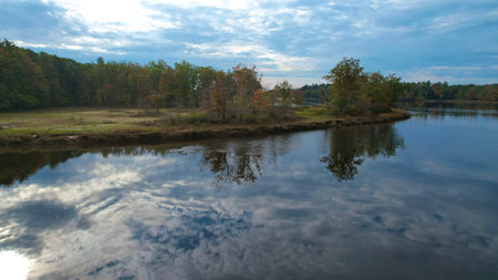 Autumn landscape with river and cloudy sky. River in autumn.