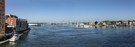 PORTSMOUTH, USA - SEP 27, 2017: view along the river Piscataqua in Portsmouth with bridge Sarah Mildred long at horizon.