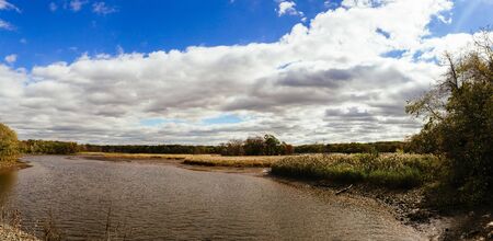 Panorama of the river and clouds on the blue sky in summer