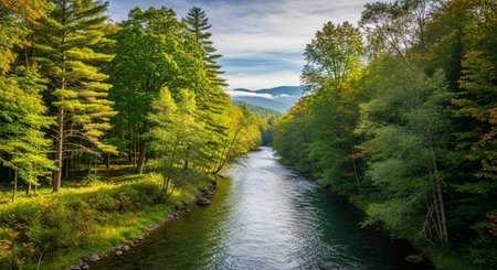 Lush green forest with a serene stream charming illustration for children's books and postcards
