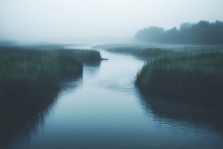 Winding river flowing through a misty wetlands landscape, tall green grasses surrounding the tranquil, mysterious waterway
