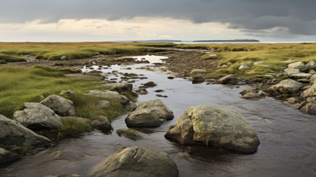 grass in the field: a captivating photo capturing the beauty of nature with lush green grass in a field. this stunning image showcases the essence of romanticized seascapes and riverscapes, reminiscent of the hudson river school art movement. taken with a hasselblad h6d-400c, this associated press photo highlights the organic stone carvings found in scottish landscapes. ai generated