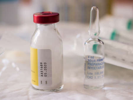 Antibiotic bottle and a steril water ampoule used in infections treatments.