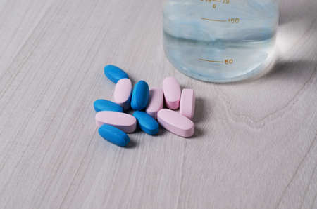 Blue and pink probiotic pills or vitamins on a wooden background