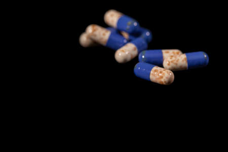 expired pills capsule isolated on black background, medication concept, health care and medicine