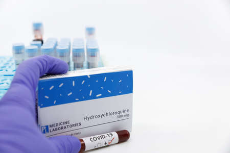 Dubai-UAE-Circa 2020:Doctor showing box of medicine with positive covid-19 test.Concept of Hydroxychloroquine medicine with blood tests tubes on the background.Cure for coronavirus,COVID-19 treatment.